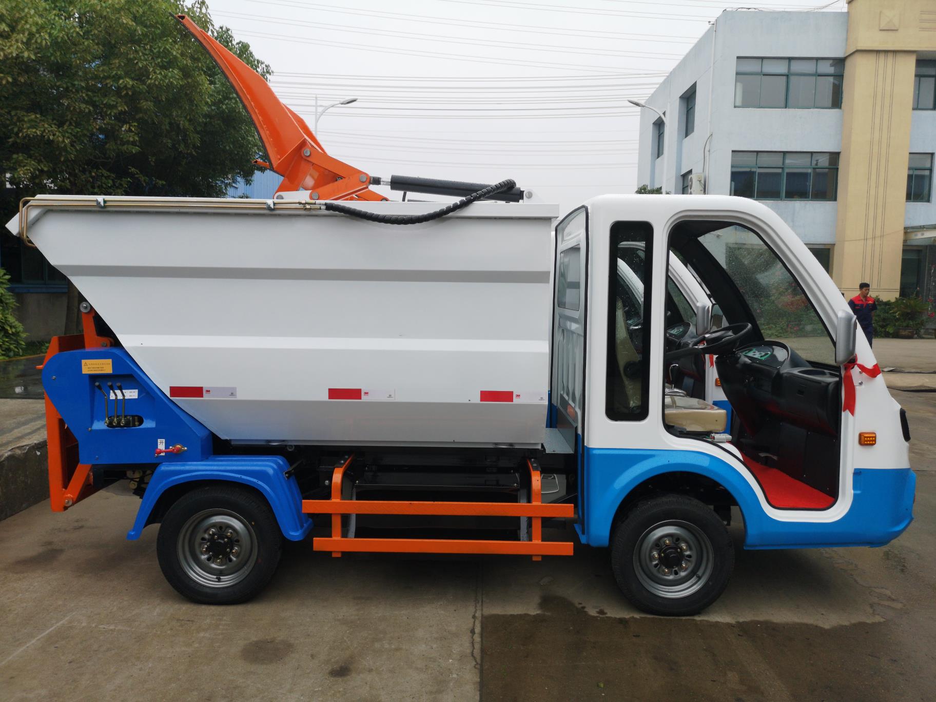Lado derecho de los camiones de basura eléctricos desarrollados conjuntamente | Lado izquierdo de desarrollado conjuntamente camiones de basura electricos | Mecanismo patentado de elevación y carga trasera diseñado y fabricado por empresa shazhou |