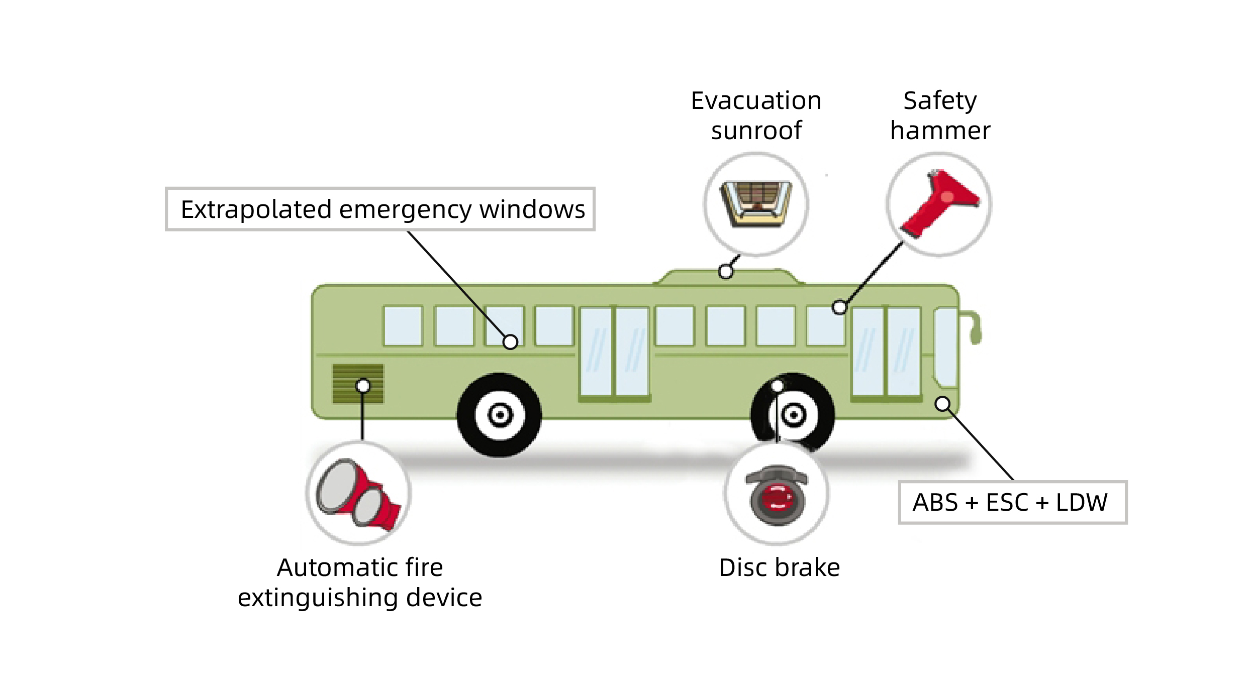 En cuanto al vehículo completo, se han añadido una serie de requisitos.Además de 'prohibir el piso por encima de la zona de conducción' para cancelar el paso de un autobús y medio de pasajeros, también se exige que no se coloquen cilindros de gas en el techo de los autobuses de pasajeros en funcionamiento, y también se limita la altura de los el maletero.Estos tienen como objetivo mejorar la estabilidad de los turismos y reducir la posibilidad de accidentes por vuelco.En la norma JT/T 1094, la cláusula más difícil técnicamente se encuentra también en todo el vehículo.Para reducir la ocurrencia de colisiones traseras, accidentes por salida de carril y lesiones causadas por accidentes, se requiere instalar un sistema electrónico de control de estabilidad (ESC) cuando la altura del vehículo excede los 3,7 metros;y los turismos con una longitud superior a 9 metros deben estar equipados con un sistema de advertencia de colisión frontal (FCWS) y un sistema de advertencia de cambio de carril (LDWS).